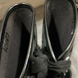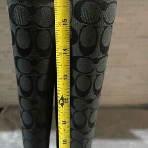 Elevate your style with Coach's black over the knee boots, featuring the iconic 'C' monogram pattern. These boots are crafted from a weather-resistant material, ensuring durability and comfort. The sleek design includes a rounded toe and a pull-on style, making them a chic addition to any wardrobe. Perfect for adding a touch of luxury to your everyday look.