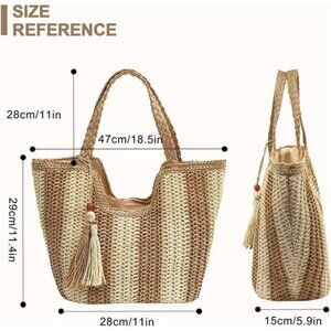 Straw beach tote bag is 29cm height, 47cm wide on the top, 28cm wide on the bottom, 15cm thick, and The top handle is 24cm long are perfect for hand or shoulder carry, making it very lightweight to carry. This woven beach tote bag is made of high quality and soft straw, lightweight, soft and comfortable, with a polyester lining, creating a beautiful and modern feel. This tote bag can be folded so you can put it in your suitcase when you travel. Wide-brimmed braided shoulder straps make it easier to carry and decompress. This beach tote bag has 1 main zipper pocket with small inner pockets. This woven beach bag is large enough to hold clothes, towels, sunglasses, cosmetics, mobile phones, books, water bottles, wallets, etc. An inner bag is convenient for storing cards, cash and other small items.
