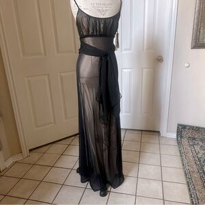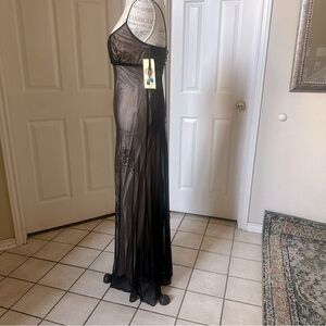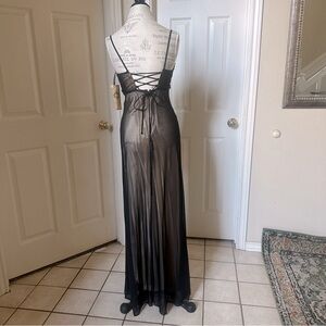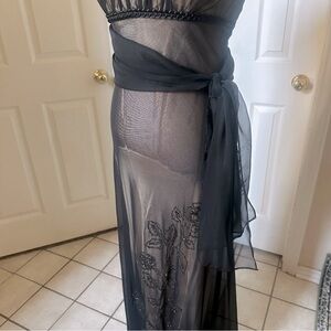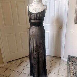 Vintage Style Design | Empire Waist | Open Back with Adjustable Criss Cross Tie Up | Black Mesh with Floral Beading | Gold Lining | Hidden Back Zipper | Detailed Stitching on the Bodice | Hanger Tabs