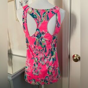 Lilly Pulitzer flowy tank top, women’s size small. Colors are vibrant (mostly pink/greens), with asymmetrical cutouts on the upper back.