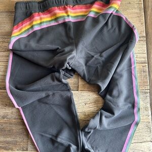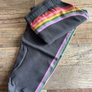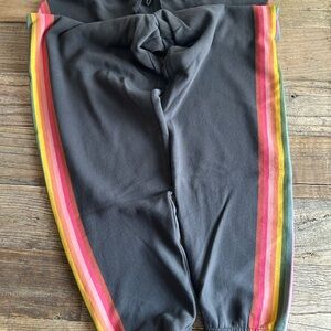 Stay comfortable and stylish with these black sweatpants featuring vibrant rainbow stripes. Perfect for casual outings or lounging at home. No tags, never worn or washed.