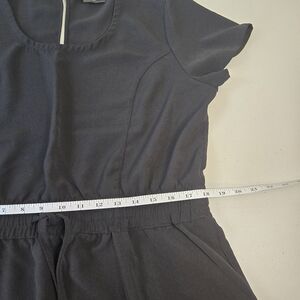 32 Degrees black mini dress, scoop neck, size Large. Pockets, elastic and drawstring waist, button at back neckline, shaping seams at the bust. 100% polyester.
