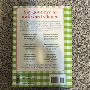 Engaging book with 375 conversation questions. Features a green and white checkered cover.