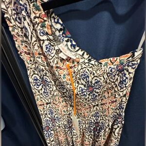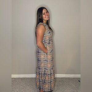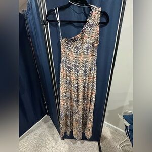 Stylish one shoulder maxi dress with intricate patterns. Features a mix of colors for a chic look. Pockets. Size XS runs big. Should work for a person wearing size small or a small medium. Model wears size 6.