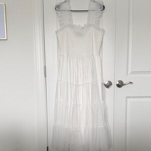 This stunning blue dress by Abercrombie & Fitch is perfect for any wedding guest or cocktail event. Featuring a flattering V-neckline and elegant flutter sleeves, it offers a chic and comfortable style. The sleeveless design and flowing midi length create a timeless silhouette, making it a versatile addition to your wardrobe. Worn once! Has pockets!