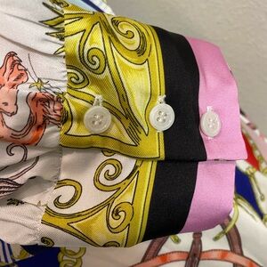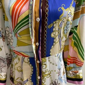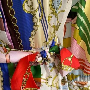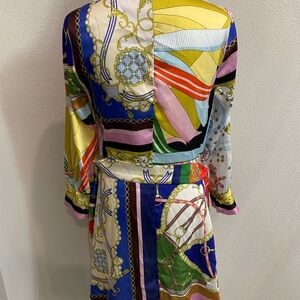 Stylish dress with intricate chain pattern. Features a blend of green, yellow, and cream tones. Button down mini dress with tie belt waist. Excellent pre-worn condition from no smoking/no pet home.