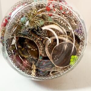 Mystery jewelry jar. Contains necklaces, bracelets, runs, brooches, pins, earrings, and pendants.