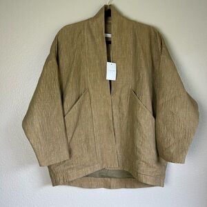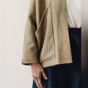 A relaxed and oversized jacket in a rounded shape is cozy and roomy, giving you the freedom to layer. Features drop shoulders, an open front and deep side pockets. A beautiful cotton-linen fabric with a slightly crinkled texture. This thick blend is a little more rigid than your regular cotton or linen, which makes it suitable for the colder months. Paired with Ali Golden Classic Tee in Cream and 7115 Pleated Linen Trouser Pants in Navy. details Made in small batch in Guangzhou, China 70% Cotton, 30% Linen Dry Clean Only Rosie is 5'8" and wears XS
