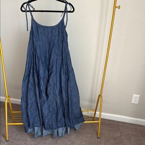 Stylish blue denim dress with tie straps. Perfect for casual outings.