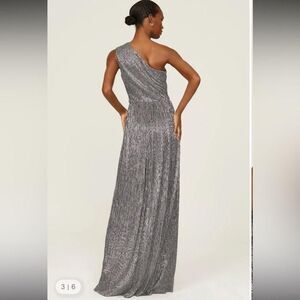 Keep your look simple and elegant in this metallic one-shoulder gown by Dress The Population.