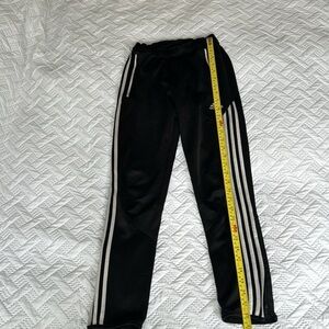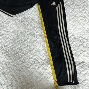 Made by Adidas. Youth medium. Size 11-12 years. Perfect for your preteen. Black with triple white stripes. ClimaCool technology. Soccer training pants. Warm up pants. Unisex. Worn a fair amount. Still in good used condition. This garment is from a smoke- and cat-free home. Outgrown now. Zippers at both ankles. Drawstring tie on inside of waist.