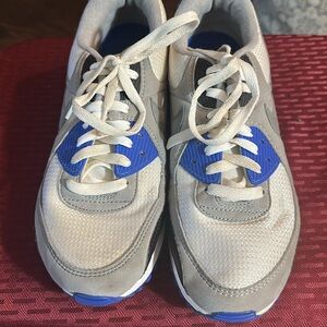 These Nike sneakers feature a stylish blend of white, gray and blue, offering a classic athletic silhouette with a modern twist. Crafted from a mix of suede and mesh, they provide both comfort and a casual aesthetic. The versatile color combination makes them perfect for pairing with various outfits.