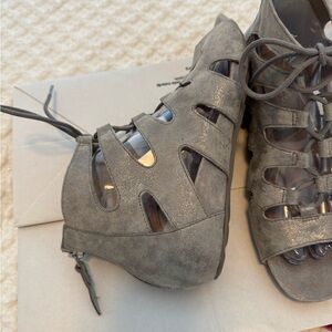 Chic Earthies gladiator sandals with a sleek design. Features a blend of silver gray tones. Ideal for everyday style. Size 8. Worn one time.