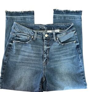 High rise cropped jeans with a little distressing and raw hem. Super flattering and comfortable. 70% cotton/ 28% polyester/ 2% Spandex.