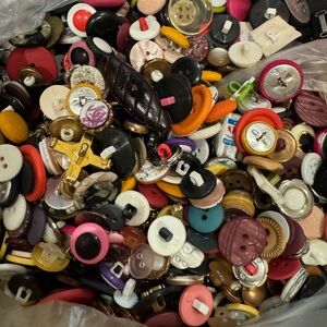 A diverse collection of vintage colorful buttons. Includes various shapes and sizes.