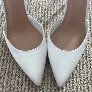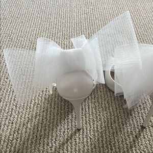 These Steve Madden heels boast a sleek pointed toe and a satin-like finish, offering a touch of elegance. The white ribbon ankle ties add a delicate detail, making them perfect for weddings or formal events. Tulle bow on back of each shoe. Only tried on at home never worn!