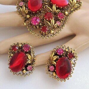 This vintage jewelry set is signed Made in Austria and features stunning red acrylic oval cabochons with pink & red glass rhinestones set in a lovely crimped goldtone setting. The set includes both earrings and a brooch, perfect for adding a touch of elegance to any outfit. The red color of the stones adds a pop of color to any outfit, making it a great addition to any fashion-forward woman's collection. Brooch measures 2 1/2" and clip Earrings are 1 1/4"..In very good vintage condition...Truly lovely set... The earrings and brooch are all signed.