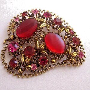 Austria Brooch Earrings red cabochon & rhinestones Set
