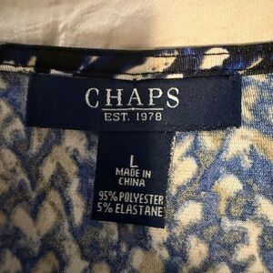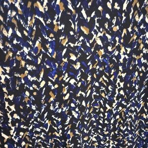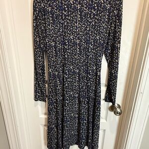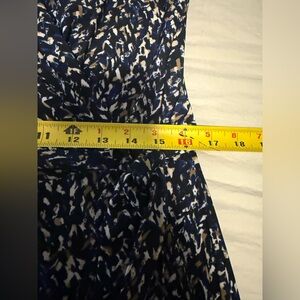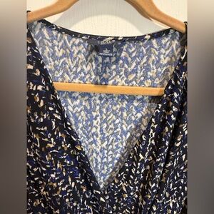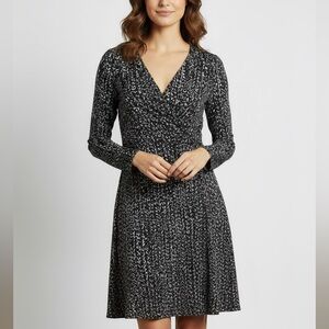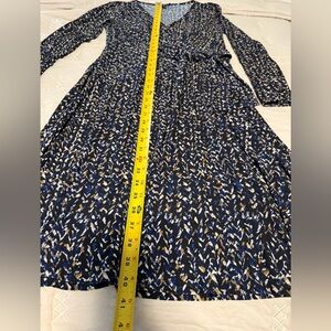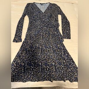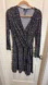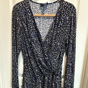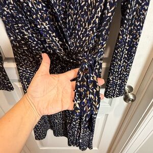 Stylish wrap dress with navy and cream pattern. Comfortable and chic for any occasion.