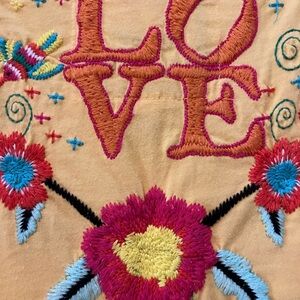 Vibrant yellow V-Neck tee with colorful floral embroidery. Features intricate designs and short sleeves. Johnny Was Los Angeles, size XS, super soft tee, 100% cotton