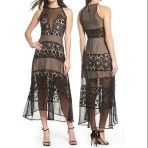 Features: tan crochet dress, fully lined, scoop neck and back, maxi length, style 3653 020
