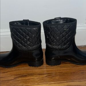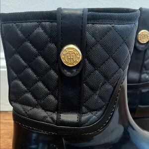 The boot bottom is a glossy rubber with a contrasting quilted shaft and gold tone Hilfiger monogram on the outer side. The boots are lined in warm, red water-resistant fabric. Threaded sole for better traction. Pull on boots.