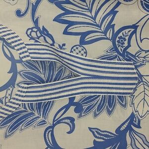 Beautiful chic top with blue and white patterns. Features a striped neckline. Tunic length with side slits to help with fit. This top may need a cami underneath.