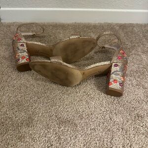 Elegant gold heels with vibrant floral embroidery. Perfect for special occasions.
