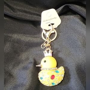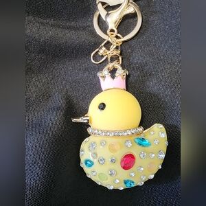 Charming yellow duck Bag Charm/keychain adorned with colorful rhinestones. Features a crown detail for a playful touch.