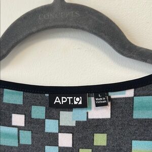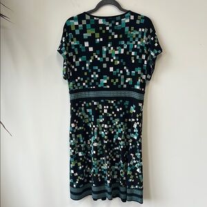 Stylish Apt. 9 dress with a geometric pattern. Features shades of green, blue, and black. Perfect for any occasion. Measurements: P2P: 22” Waist: 17-18” Length: 40” Fabric: 96% polyester, 4% spandex.