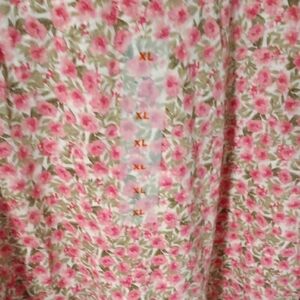 Stylish top with pink floral pattern. Features green accents. Ideal for everyday wear. 26 inches long, and 22.5 inches underarm to underarm.