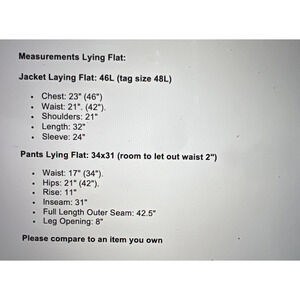 Size: Jacket: 46L (tagged 48L) / Pants: 34x31