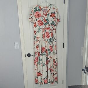 This elegant cream maxi sundress features a vibrant floral pattern with coral pink roses and green foliage. Designed with a V neck and short sleeves, it offers a romantic silhouette with a cinched waist and flowing skirt, perfect for a wedding guest or resort wear.