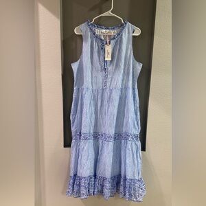 Chic blue and white striped dress by Vineyard Vines. Features floral accents around the neckline and bottom of dress. Dress is 100% Cotton (lined). Features ruffled neckline with knotted ties, tiered skirt with contrast print, and pockets at side seams. Originally $248.