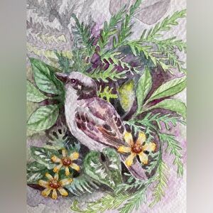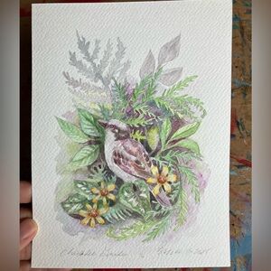 A vibrant splash of nature's beauty on this 8 x 6 inch painting, this original art captures the essence of a chickadee amidst stylized garden foliage. The watercolor technique lends a soft, textured feel to the bird's plumage, with soft colors and subtle shading,” bringing it to life. Making this piece a standout addition to any room. This art is perfect for brightening up a home office, or gifting for a bird lover.