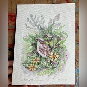 Keywords: botanical art, bird illustration, nature painting, bird art, watercolor painting, wall decor, small art, nature art, bird lover gift, bird painting, floral art, original art, home decor, chickadee painting