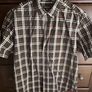 • Features: Button front, long sleeves, front chest pocket, collared neckline