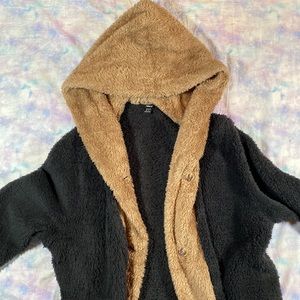 tags: fall winter fuzzy furry faux fur sherpa unique sleeves color block colorblock earth tone business casual office fun warm cozy long trench sweater overcoat shrug dress up dress down at home sahm fireside ski warm tone tan buttons open