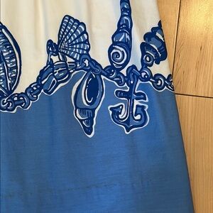 This charming sundress by Lilly Pulitzer showcases a captivating ombré design, gracefully transitioning from white to blue. The sleeveless style with a scoop neckline is beautifully adorned with shell print, adding a playful touch to its casual resort wear appeal. Made from a lightweight fabric and is lined, it offers a breezy silhouette perfect for relaxed outings. Some fading but in great shape. An all time favorite dress of mine!