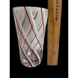 Vintage St Nicholas Square Barware Christmas Peppermint Ln Handblown Glass Tumbler With Red & White Swirl Design. Elegant and visually striking, this handblown glass tumbler features a unique red and white swirl design. Ideal for adding a touch of sophistication to your drinkware collection. EUC. No cracks or chips. Height = 6 inches