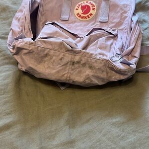 This Fjallraven Kånken backpack in lavender is well-loved but still has plenty of life left. Main wear is seen on the bottom of the bag, but could probably be removed with a good washing.