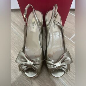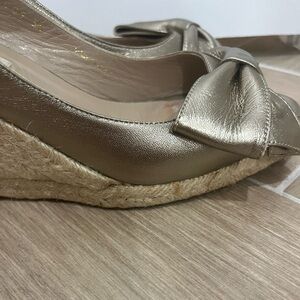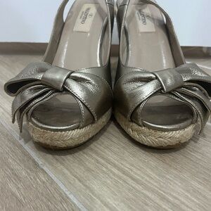 Authentic Valentino Garavani Metallic Gold Leather Bow Espadrille Wedges