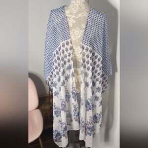 Short jacket with layered sleeves. Zips up the front. Round neck.