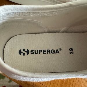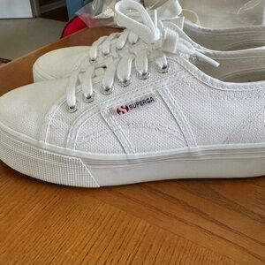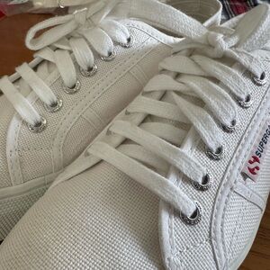 Timeless Superga sneakers in crisp white. Comfortable and stylish. Good condition only wore a few times! Euro Size 39 Includes Box!