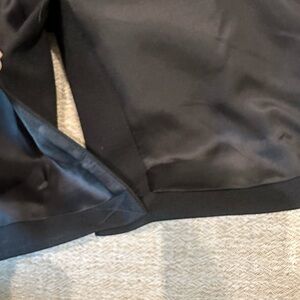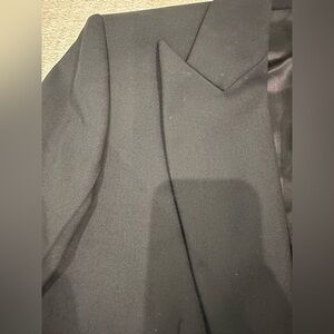 Black fitted long blazer. The back slit is still sewn shut. Has light shoulder padding and sleeves flare out a bit