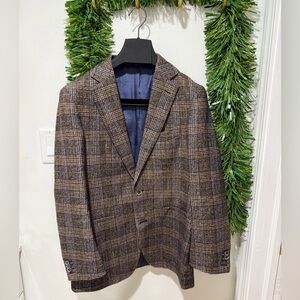 Experience the refined elegance of Suitsupply's sport coat, featuring a sophisticated blue and brown color palette. This sport jacket will be great for the summer Made of silk,linen, and cotton woven from the famous textile mill Vitale Barberis Canonico.