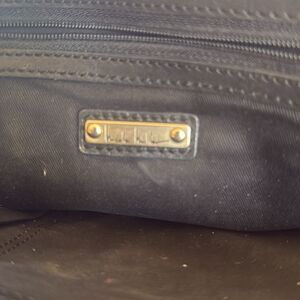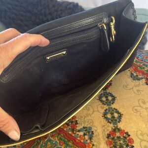 NICOLE MILLER black pony hair clutch with gold triangle leather and detailed stitching. In good used condition. See pics. Interior zipper pocket, key chain holder and pen and small pocket.