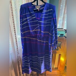 Stylish blue dress with colorful stripes. Features a flattering V-neck and long sleeves.