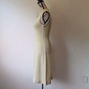 Elegant cream midi dress. Features a sleeveless design. V-neck with intricate knit pattern. Perfect for any occasion.