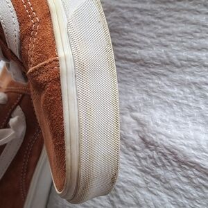 Classic Vans sneakers in tan suede. Features white laces and trim. Get your skateboard ready and look stylish while boarding!! Soles are in excellent shape! Sneakers are in really good shape. Some light grass staining on the sole of both shoes (see pics). Pet friendly home. Bundle to save on shipping.
